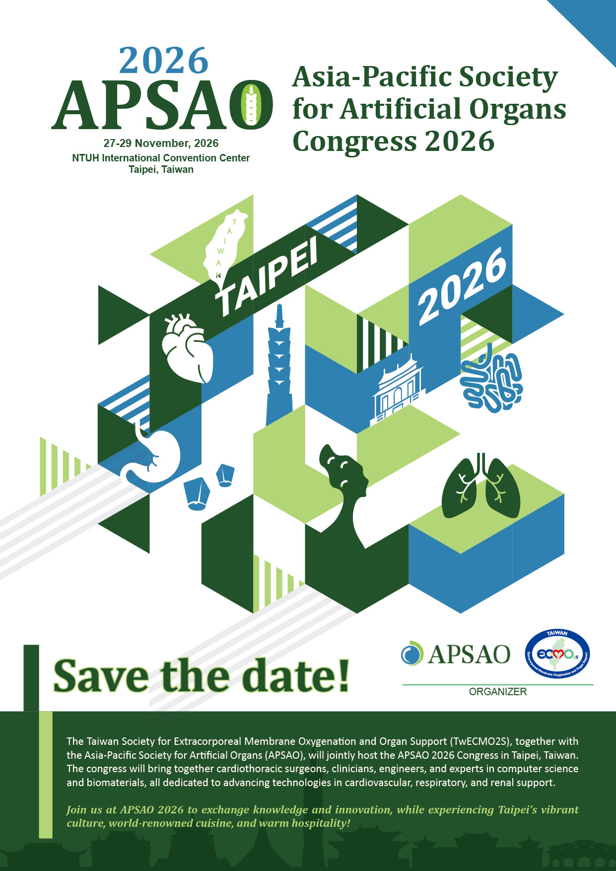 2026年第9屆亞太人工器官學術大會9th Annual Congress of the Asia-Pacific Society for Artificial Organs (APSAO 2026)會議(簡稱APSAO 2026)乃由The Asia-Pacific Society for Artificial Organs (APSAO)授權主辦,該會創立於2013年,旨在促進亞太地區人工器官相關領域之學術研究、臨床應用與產業發展。自創立以來,APSAO 匯聚了來自亞洲、澳洲及太平洋區域的專業醫師、科學家、工程師及臨床研究人員,致力於推動人工器官、血液分離術、組織工程、生物材料及再生醫學等領域的發展與合作。